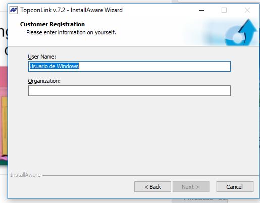 Buenas tardes al instalar el programa Topcon Link me solicta estos datos: User name y Organization. Quisiera saber que información debo ingresar en estos campos.